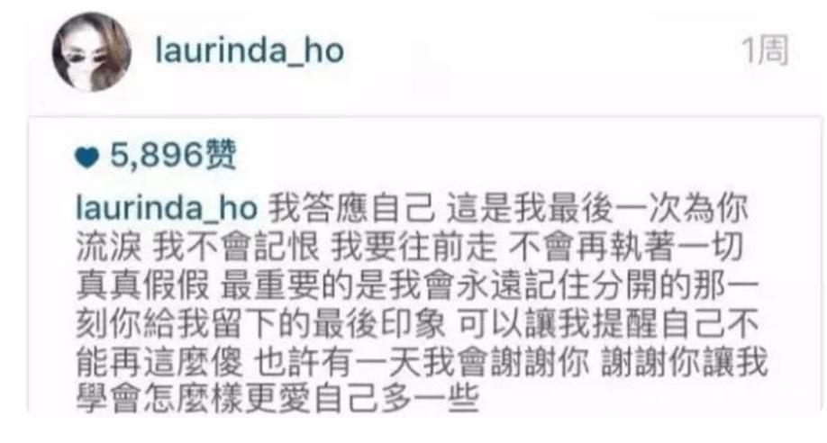 彼时,何超莲在社交账号上痛苦地发文:这是我最后一次为你流泪,不会再执著一切真真假假,最重要的是我会永远记住分开的那一刻你给我留下的最后印象,可以让我提醒自己不能再这么傻,也许有一天我会谢谢你,谢谢你让我学会怎么样更爱自己多一些!